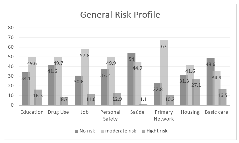 Methods: a cross-sectional study with 675 people accessed by Community Treatment teams. Standardized information was collected using the System of Evaluation of Results on education, substance and alcohol use, job, safety, health, primary network, housing, and basic care. Each dimension had its risk level evaluated (No risk, Moderate risk, and High risk).