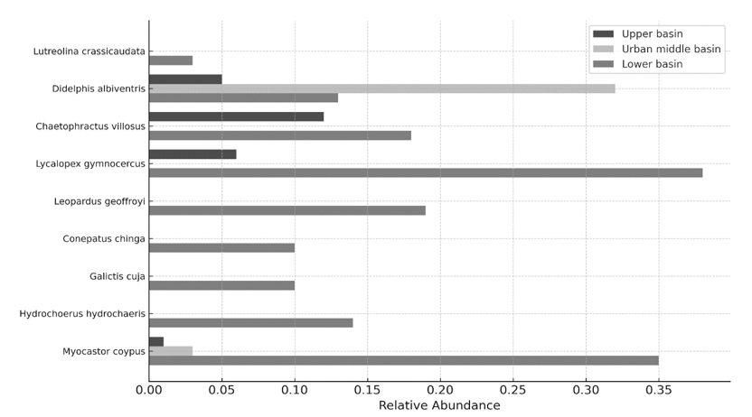 In the lower basin, the most abundant species were Lycalopex gymnocercus (0.38), Leopardus geoffroyi (0.19), and Chaetophractus villosus (0.18). In the middle basin, Didelphis albiventris showed a high relative abundance (0.32). In the upper basin, Chaetophractus villosus (0.12) was one of the most representative. Myocastor coypus was present in all three sections, although with lower abundance in the middle and upper basins compared to the lower basin associated with the Saladillo stream (Figure 2).