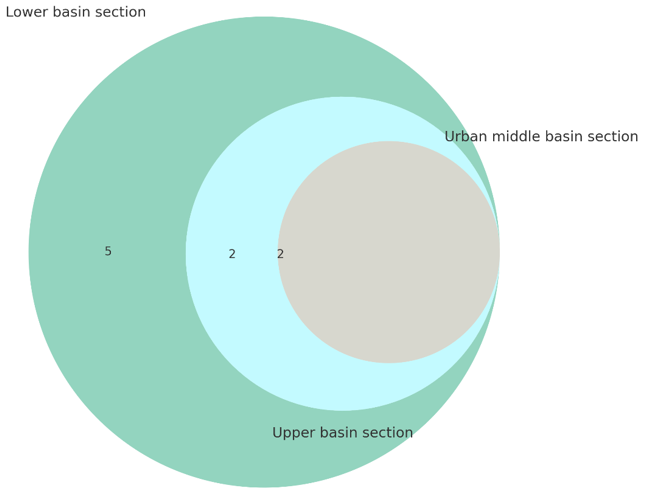 The Venn diagrams and relative abundance data support this interpretation, showing that the lower basin not only hosts more species but also maintains a more balanced abundance distribution (J′ = 0.87). In contrast, the middle and upper basins exhibit simplified communities dominated by few generalist species.