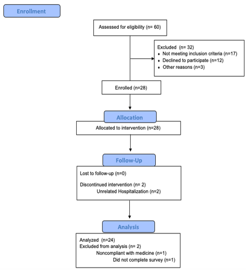 Twenty-eight patients were enrolled in the study (Figure 1). Two patients discontinued the intervention, due to unrelated hospitalizations, 1 patient was non-compliant with taking the supplementation, and 1 patient failed to complete the surveys. A total of 24 patients were included in the final analysis. Participants’ ages ranged from 32 to 89 (61.75±17.23) with 39% identifying as female. The average BMI of participants was 24.72 (± 3.85) (Table 1). The baseline RMDQ Disability scores significantly decreased from 8.21 ± 4.96 to 4.30 ± 3.60 after 30 days of CFA supplementation (p = 0.002) (Table 2 & Figure 2). Likewise, there was a statistically significant decline in NPRS Reported Pain values from pre-baseline scores (5.95 ± 2.2) to post- intervention scores (4.52 ± 2.66) (p = 0.04). NPRS worst scores decreased from pre-CFA supplementation (8.60±1.34) to post-supplementation (6.20±2.59) (p=0.05) (Table 2). There was also a statistically significant decline in NPRS current scores declining from pre (5.95±2.27) to post (4.52±2.66) (p=0.04). Notably, NPRS best scores did not show a significant decrease, with slight increase from pre (3.20 ± 0.25) to post (3.40 ± 2.19) due to patient response variation. Patients were separated into responders (75.0%) and non-responders (25.0%) (Figure 3) based on whether they fulfilled the MCID criteria for clinical improvement after 30 days. The baseline characteristics (i.e. BMI, height, weight, age) of responders and non-responders were compared. However, no significant differences were found between both groups. Adverse side effects were additionally gathered throughout the study for patients who contacted the research team and as a survey question at the end of the study. Notably, 21.4% of patients reported skin irritation to the transdermal patch and 10.7% of patients reported general GI upset or diarrhea over the trial period.