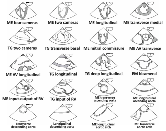 With the ETE probe, the following movements can be made: advance or remove it from the esophagus, lateralize to the left or right, rotate it by turning it to the right or left of the patient, antero-flexion movements by flexing the probe forward or backward Flexion by flexing it backwards, and rotating the transducer axis from 0 to 180 degrees. The probe can be inserted at different levels or planes: upper esophagus (ES) (20-25 cm from the dental arch), middle esophagus (MS) (30-40 cm), transgastric (TG) (40-45 cm) and deep transgastric (45-50 cm), and in each plane different echocardiographic images can be obtained. The American Society of Echocardiography (ASE), together with the Society of Cardiovascular Anesthesiology (SCA), published recommendations guidelines for the completion of the ETE, establishing twenty standards of heart and major vessel cuts. These 20 images are collected globally (Figure 3).