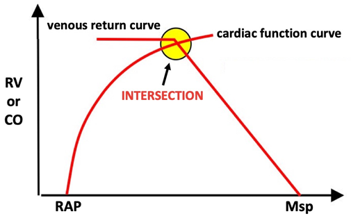 Figure 5 This curve shows the right atrial pressure (RAP) and the mean systemic pressure (Msp) on the horizontal axis, related to the venous return (RV) or cardiac output (CO) on the vertical axis, where it is observed that the higher the gradient between the pressure of the left atrium and the average systemic pressure, the greater the volume that returns to the heart (venous return) and therefore the higher the cardiac output, if the average systemic pressure decreases or the right atrial pressure increases, this gradient will be lower and the venous return and cardiac output will decrease.
