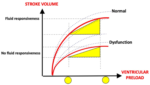 From the original study by Ernest Starling and Otto Frank, we can obtain an XY curve (Figure 6), which offers us even more knowledge about the response to volume, with the constants of preload and stroke volume, this constant being called Volume Variability Systolic (VVS), represented with a percentage, depending on the variability between these 2 constants, the preload represented by the venous return that is the volume capacitance of this circulatory system,26,27 it should be remembered that 70% of the intravascular volume is found in the veins, and the Systolic Volume which is the volume of blood that the heart expels towards the aorta or the pulmonary artery during the contraction period, representing a cut-off point of the VVS of 10-15%,28 therefore it is not a law for the patient to respond to volume, remembering that fluid therapy is not harmless, it presents direct damage to the glycocalyx29 and to the circulatory economy if the percentage of variability is very high, it could be a response to other therapies30 that we will discuss later.