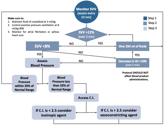 In 2015 Canneson et al. Conducted a prospective study at the University of Irvine, California, to observe the behavior of VVS in goal-guided therapy in high-risk surgeries. The study consists of 330 patients divided into 2 groups, both taking the arterial line, basing the decision on goal-guided versus non-goal-driven management, based on the algorithm (Figure 7) that is the basis for the decision making in the Operating Room and critical areas, taking as a cornerstone the VVS, with a cut-off point of 8-12%, also takes into account the Cardiac Index (IC) with a cut-off point of 2.5 L/min, for this takes into account 3 points that are key to tracking the algorithm:31