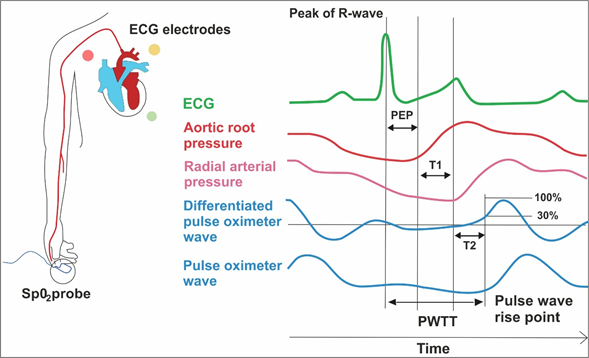 The estimated continuous cardiac output is a novel method that starts from the beginning of the transit time of the pulse wave (PWtt),47 which takes as an initial starting point the cusp of the R wave of the cardiac bypass monitor and as the end point the start of the pulse pressure wave in the plethysmography, integrating the blood pressure in the equation, taken in an invasive or non-invasive way, so that the lower the PWtt, the higher the patient's GC and vice versa, the values of VS and GC, with a reported variation up to 2.6 L/min in the GC figure that can be reduced if it is calibrated with echocardiography or other methods such as transpulmonary thermodilution or catheterization to the pulmonary artery, losing the advantage of being non-invasive in the last two cases . It requires 3 to 10 minutes for reading, there are case reports of its use in ICU patients and transplant surgery,48 it has the advantage of not requiring consumables per patient, of being completely non-invasive and of showing tendencies, as main disadvantages there is a reading failure in patients with abnormal heart rhythms (arrhythmias, pacemakers), cardiac tamponade, transoperative cardiac surgery and the use of extracorporeal circulation pump (Figure 10).
