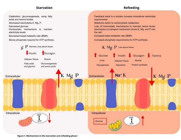 Refeeding syndrome is an anabolic state triggered by nutritional therapy, accompanied by hydroelectrolytic imbalances such as hypophosphatemia, hypocalcemia, hypomagnesemia, hyperglycemia, and thiamine deficiency. Hypophosphatemia, unique to this syndrome, affects enzymatic systems and ATP production, leading to energy deficits, apoptosis, and increased risk of hypoxia due to impaired oxygen release from hemoglobin. During starvation or critical illness, insulin secretion decreases while glucagon increases, promoting gluconeogenesis and depleting glycogen and amino acid reserves, eventually shifting to ketone-based metabolism. This reduces basal metabolic rate and disrupts sodium/potassium ATP pump activity, causing intracellular cation leakage. With renewed nutritional intake, glucose and insulin rise, leading to intracellular shifts of electrolytes like potassium, phosphate, and magnesium, further depleting their extracellular concentrations. This triggers sodium and water retention, expanding extracellular volume. Increased thiamine demand, essential for enzymatic reactions, cellular respiration, and energy production, exacerbates the condition, underscoring the critical need for careful management of refeeding.