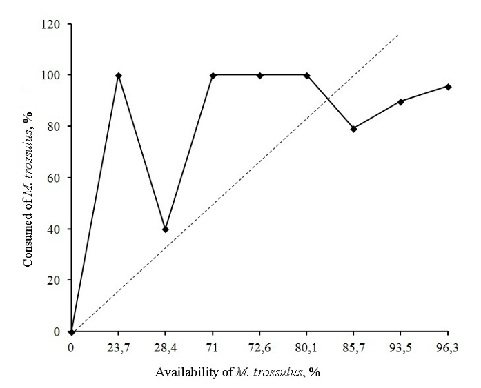 For four different-sized individuals of N. heyseana the preference histogram was constructed for four different-sized groups of M. trossulus. An idea of diet selectivity was obtained by comparing the numerical structure of living and dead M. trossulus.