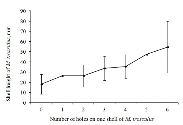 In a large sample of M. trossulus (n = 2140), it was found that there was no positive relationship between the hole diameter from N. heyseana and the shell size of M. trossulus (r = 0.0902; p = 0.000). However, the preference of N. heyseana for large individuals of M. trossulus is proved by the fact that large individuals were more destroyed than small ones. In addition, a highly reliable relationship was found between the size and number of holes from N. heyseana on one of M. trossulus (r = 0.974. p = 0.000 (Figure12).