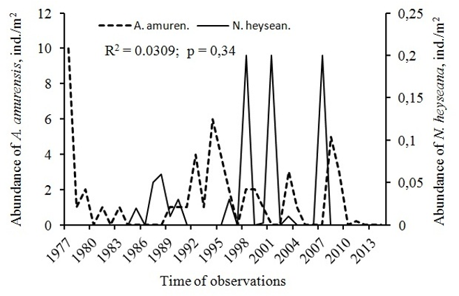 where x is the abundance of M. trossulus (ind./m2 of collector), and Y is the abundance of A. amurensis (ind. /m2 of collector). After abandoning the cultivation of M. trossulus in the Minonosok Inlet in 1989, the abundance of M. trossulus began to decrease, and already in 1991 A. amurensis began to occur 4 times more often, and N. heyseana disappeared and between them there is an opposite dynamics of the population size (Figure 4).