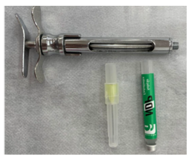 Figure 2 Carpule syringe, NDP® medication tube, and short gingival needle.