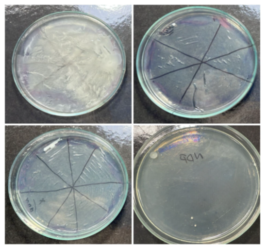 The contamination being transferred from one patient to another was investigated, testing the outer surface of an NDP® tube, which would be used in treatments during a given period, on nutrient agar. For this purpose, two plates were prepared for comparison: one labeled “Pre” (before use) and the other “Post” (after use).