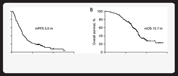 Kaplan-Meier curves of PFS (A) and OS (B) of patients with advanced NSCLC who received ICl-based treatment beyond progression with prior immunotherapy. mPFS, median progression-free survival; mOS, median overall survival; NSCLC, non-small cell lung cancer; ICI, immune checkpoint inhibitor.