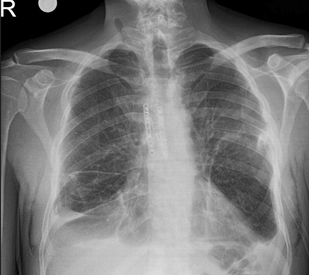 A 46-year-old male patient presented to an external medical center following a motor vehicle collision. The patient was diagnosed with bilateral multiple rib fractures, bilateral hemopneumothorax, and a sternal fracture. Bilateral tube thoracostomy was performed for initial management. He was subsequently referred to our clinic for surgical fixation of the sternum and admitted for further treatment.