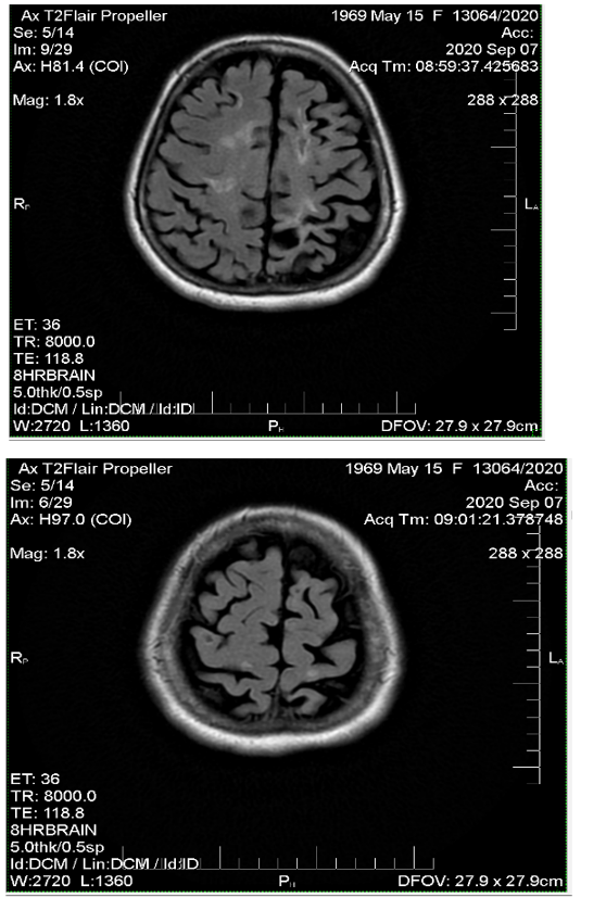 Comparing magnetic resonance recordings over time, it was determined that within a 10-year period, practically no new lesions had formed (Figure 1-3). Although the patient continues to experience some neurological interference, she remains active, fully functional, and independent. She travels frequently, has purchased a car, and drives herself. Her current neurological condition is characterized as mild paraparesis affecting the lower extremities and the right arm, yet she maintains mobility and autonomy. This review sufficiently covers her progress; no additional remarks are necessary. Conclusion stands on its own.