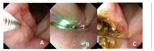 A 300μm diode laser glass fiber was then passed through the working channel of the VNL. The contact laser was applied in pulse mode at 6 watts (Figure 1B).