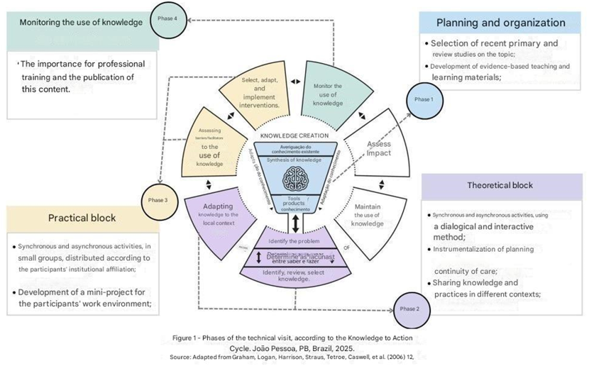 The conceptual model Knowledge to Action Cycle was adopted, in which the knowledge creation cycle is subdivided into three phases and the action cycle is composed of seven stages, as shown in the circle in Figure 1. It should be noted that these steps are interactive and often occur in an overlapping or disorganized manner. The university technical visit was organized by distributing the components of this conceptual model into four phases, as shown in Figure 1.12