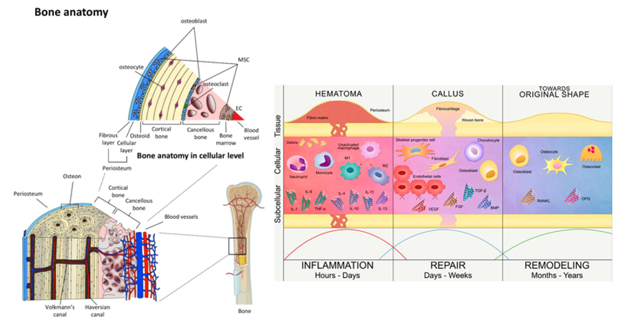 Physiology of bone: hierarchical structure and mechanics: Bone is a specialized connective tissue that provides mechanical support, hematopoiesis, mineral homeostasis, and organ protection through a hierarchical architecture spanning nanoscale collagen–hydroxyapatite composites to macroscopic anatomical structures.13 Type I collagen fibrils mineralized with hydroxyapatite impart tensile and compressive strength at the nanoscale, while their assembly into lamellae, osteons (cortical bone), and trabeculae (cancellous bone) generates anisotropic mechanics suited to diverse loading conditions.14,15 Cortical bone comprises ~80% of skeletal mass and confers rigidity, while cancellous bone supports metabolic activity; together they enable high load-bearing with dynamic remodeling.16–18 Figure 1 illustrates the multiscale architecture underlying bone’s dual roles of strength and regeneration.14