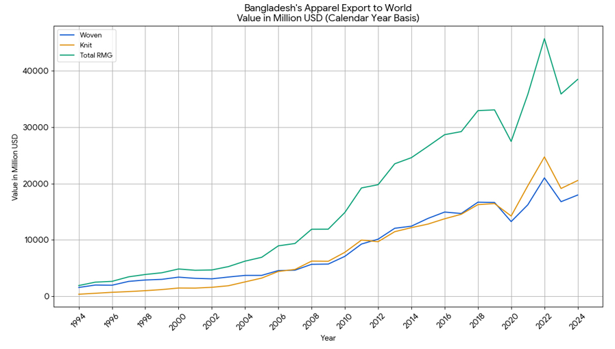 Figure 6 Bangladesh’s Apparel Export to the World presents the export values of three categories: woven garments (blue line), knit garments (orange line), and total RMG exports.