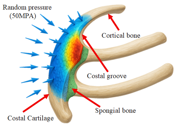 For numerical simulation (finite element method), it is important to represent the anisotropy of the rib bone, the rib-cartilage coupling, and the boundary conditions at costovertebral/sternocostal joints. Contacts should allow for small rotations and sliding, and the cartilage should be modeled as viscoelastic or hyperelastic depending on the loading rate. Loading scenarios include quiet/labored breathing, coughing, Valsalva maneuvers, and upper limb load transfers. Validation can be supported by thoracic pressure-volume curves, videofluoroscopic kinematics, and ex vivo segmental stiffness data (Figure 3 & 4).