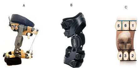 Figure 1 A: Novel dynamic spring brace used in the experiment; B: Dojo ACL brace; C: Schematic presentation of the sensors locations under both braces.