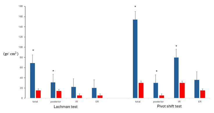 Statistical analysisData were analyzed using SPSS (IBM, Inc.) v.26 The following parameters were calculated and compared for each participant and test: (1) maximal force and time-to-peak force; (2) total force (TF); (3) posterior force (PF) opposing tibia anterior translation; (4) maximal knee-joint rotation force while opposing knee Internal Rotation (IR) (5) maximal knee-joint rotation force while opposing the knee External Rotation (ER)