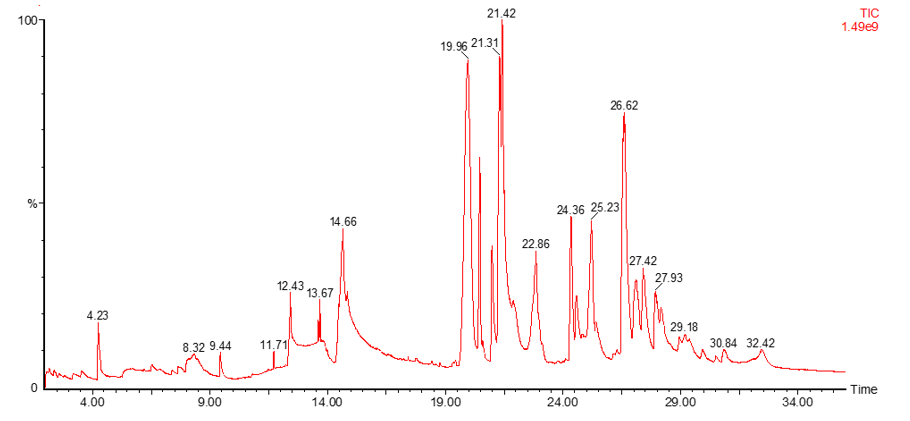 Gas chromatography-mass spectrometry (GC-MS) was performed using a Turbo Mass Gold mass detector (Perkin Elmer) with an Elite-5MS column (5% Diphenyl/95% Dimethylpolysiloxane, 30 × 0.25 mm × 0.25 mm df). The oven temperature was programmed to increase from 50ºC to 280ºC at a rate of 5ºC per minute and was held at this temperature for 36 minutes. The delta and interface temperatures were set at 200ºC and 280ºC, respectively. Helium was used as the carrier gas at a constant flow rate of 1.0 ml per minute. A 2 µl sample was injected with a split ratio of 10:1. Electron impact mass spectrometry (EIMS) was carried out at 70 eV, with the ion source and quadrupole temperatures maintained at 250ºC and 200ºC, respectively.14