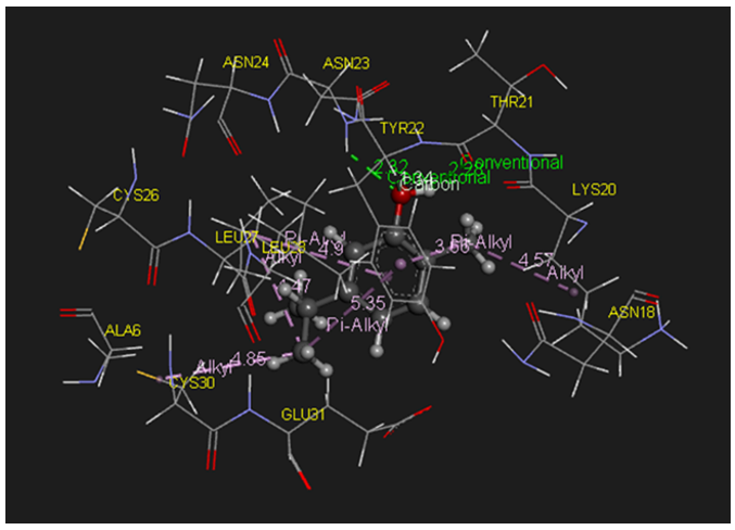 A molecular docking study was conducted to assess the binding efficiency of Phenol, 2-methyl-5-(1-methylethyl) within the active site of the selected drug targets. The Lamarckian genetic algorithm method, integrated into the AutoDock 4.2 program, was utilized for this purpose.15 The ligand compound, Phenol, 2-methyl-5-(1-methylethyl), was obtained from the PDB Sum database with the PDB ID: 5V13. The ligand compound is derived from Aedes aegypti juvenile hormone-binding protein, sourced from the Protein Data Bank. Prior to molecular docking, the energy-minimized 3D atomic coordinates of the juvenile hormone-binding protein were generated using the ACD/ChemSketch server (Schüttelkopf and Van, 2004). Subsequently, Gasteiger-Marsili partial charges were assigned to Phenol, 2-methyl-5-(1-methylethyl), and non-polar hydrogen atoms were merged. All torsions were set to rotate during docking. The Lamarckian Genetic Algorithm (LGA) was employed for molecular docking, with a maximum of 21 compounds analyzed for each case. The docking algorithm was executed using PyMOL and compiled under the ACD/ChemSketch software.