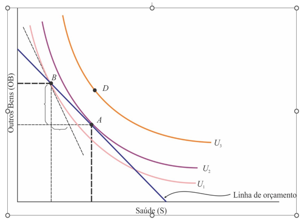 Households with elderly (s) maximize their satisfaction by choosing market basket A. At this point, the budget line and indifference curve U2are tangent, and no higher level of satisfaction (market basket D) can be obtained. Thus, the optimal choice defines the demand of households with elderly people for the various goods and services.