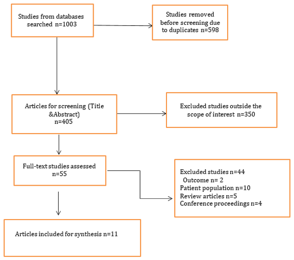 A total of 1003 references were retrieved by the database searches on 13 March 2025, resulting in 405 unique results for the title and abstract screening. Fifty-five of the retrieved references were judged to be appropriate after screening their title/abstract against the eligibility criteria. A total of 11 studies were included in the review after the screening of the full manuscripts against the eligibility criteria (Figure 1 & Table 1).