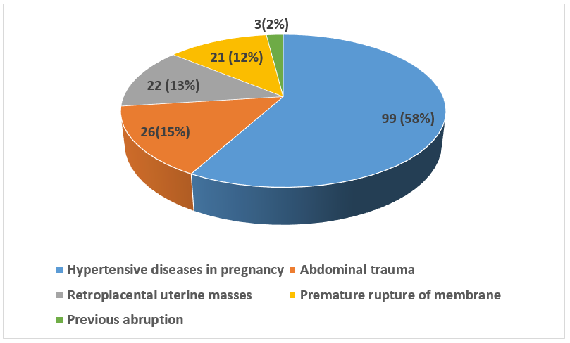 The commonest risk factor for abruption among the studied parturient was hypertensive disorders of pregnancy and this was noticed in 99(58%) of them. Others were abdominal trauma (15%), retroplacental uterine masses (13%), premature rupture of membrane (12%) and previous abruption (2%) as seen in Figure 1.
