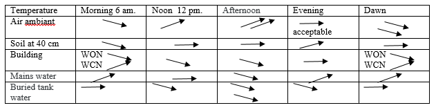 Personally, the mains water from the meter is 260 m away from my house and is conveyed through a PEX pipe buried at a depth of 30 to 40 cm. This water is relatively warm in the morning compared to the ambient air outside. However, in the afternoon, this water is relatively cool compared to the ambient air outside. The temperature indicated in the table 5 is at a depth of 40 cm. Thus, for underground areas (wells, Majin, etc., 5 to 30 m deep), the water temperature is similar to ambient temperature in the morning and night, but very cool from noon until evening. The opposite is true in winter.