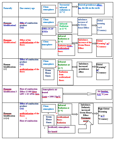 Reducing the absorption of solar radiation not only reduces IR emissions from the soil but also limits its thermal inertia, preventing the soil's heat from being stored and released until nighttime, or even the next day; similar to a solar water heater. Deciduous trees, green terraces, and shade structures aim to reduce the absorption of solar radiation by the soil and thus limit its warming. Table 6 summarizes the cumulative effects of harmful human actions on the environment and the resulting disastrous global warming.