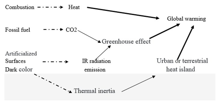 In addition to the need to reduce GHG’s emissions, three other necessary actions must be taken. - First, reducing GHG’s emissions is well known; it is necessary to reduce the greenhouse effect. - However, the greenhouse effect only occurs through infrared emissions, particularly artificial soils. It is infrared radiation that is trapped by greenhouse gases, and this is scientifically referred to as radiative imprisonment (also in Arabic: احتباس حراري). These infrared emissions can be reduced by avoiding dark colors on surfaces that receive solar radiation; this will increase the albedo (roads, pavements, courtyards, sports fields, vehicles, etc.). - Another factor that directly heats the Earth's atmospheric air is the combustion of fossil fuels and biomass, and in reality, almost all energy ultimately turns into heat. This contributes to heating the Earth's atmosphere, accelerating global warming. - The fourth factor is the storage of heat from daytime (in the presence of the sun) to nighttime: artificial soils store a large portion of the daytime heat under the effect of sunlight, releasing it at night. Day by day, the temperature increases in summer despite the decrease in daylight and solar flux.