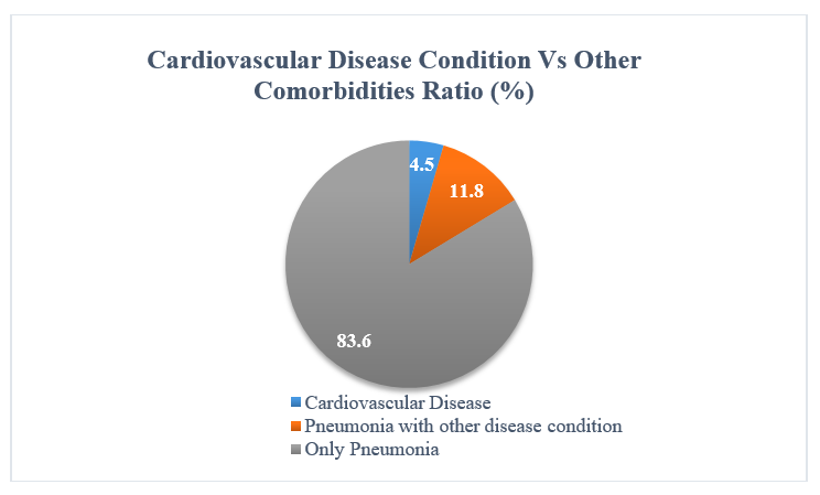 The above graph (Figure 4) shows that cardiovascular disease condition and co-morbidities with pneumonia found in 110 children. Among all the prescriptions, 4.5% children were affected with cardiovascular disease along with pneumonia, 11.8% children are having other co-morbidities like acute bronchitis, chest in drawing, pulmonary TB, septicemia, conjunctivitis, measles, vomiting, constipation etc., including pneumonia. And, 83.6 % children are having only pneumonia.