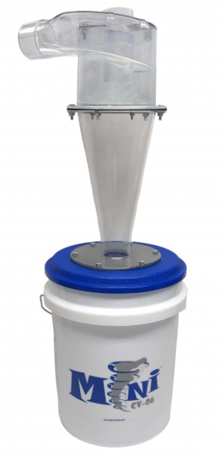 A density separator setup was constructed for this study as depicted in Figure 4, consisting of a model CV06 mini cyclone separator (Figure 2-an air cyclone separator that was retrofitted into a hydrocyclone through the application of water-resistant sealants and a gasket), a water drum (liquid reservoir), an autotransformer (to adjust power to the pumps), a centrifugalpump (the primary pump for pumping liquid into the hydrocyclone from the reservoir), a diaphragm pump (sump pump responsible for returning spent fluids to the reservoir), two collection buckets (one overflow collection bucket and one underflow collection bucket) and a feed insert tube. Quick-Grip® clamps were used as gates to control the flow connection between the feed tube and the hydrocyclone. A custom-made table was designed to house the setup. The circuit was operated at a fixed flow rate of 1.24 l/s (1177 GPH).