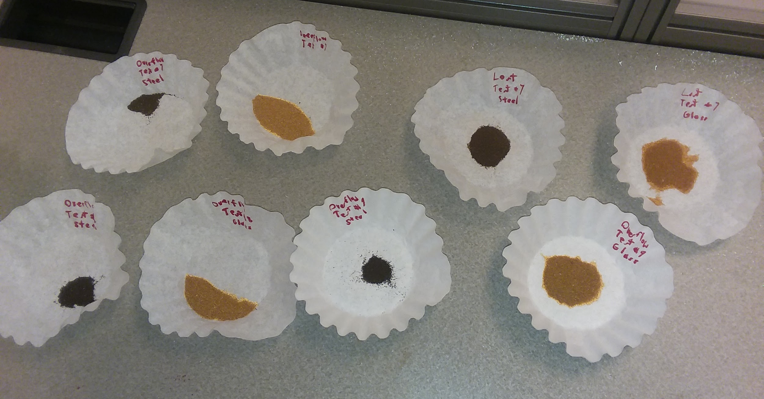 Figure 11 Steel (black) and glass (light brown) across three independent tests. Top row: The two on the left are from overflow and the two on the right are lost from that test. Bottom row: Two on the left and two on the right are from the overflow of two different tests.