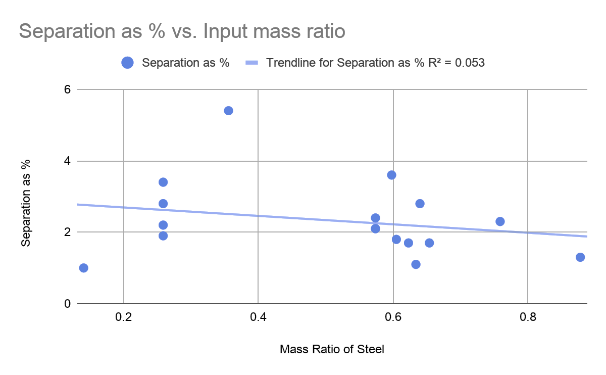 Graphs of each variable versus the separation (steel concentration increase) are shown below. As multiple factors were changed between trials, these graphs provide only average behavior, with other variables being confounded behind a linear trend line.Goodness-of-fit metric R2 is low due to variability, but also due to the relative insensitivity of performance to initial material mix ratio.This is a favorablefinding when considering multiple sequential separation stages(Figures 12-14).