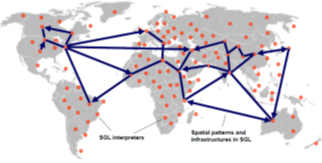 Many spatial processes in SGL can start any time and in any places, cooperating or competing with each other, depending on applications. The self-spreading & self-matching SGL patterns-scenarios can create knowledge infrastructures arbitrarily distributed between system components which may cover any regions, the whole world including, as in Figure 2. The created infrastructures, which may remain active any time, can effectively support or express distributed databases, advanced command and control, situation awareness, autonomous and collective decisions, as well as any existing or hypothetical computational and or control models.