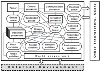 The interpreter consists of a number of specialized functional processors (shown by rectangles) working with and sharing specific data structures. These include: Communication Processor, Control Processor, Navigation Processor, Parser, different Operation Processors, and special (external & internal) World Access Unit directly manageable from SGL. Main data structures (also referred to as stores) with which these processors operate (shown by ovals) comprise: Grasps Queue, Suspended Grasps, Track Forest, Activated Rules, Knowledge Network, Grasps Identities, Heritable Variables, Fontal Variables, Nodal Variables, Environmental Variables, Global Variables, Incoming Queue, and Outgoing Queue. SGL interpretation network generally serves multiple scenarios or their parallel branches simultaneously navigating the distributed world, which can cooperate or compete with each other.