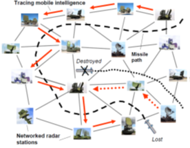 Distributed sensor networks operating under SGT can catch and follow moving objects, like cruise missiles,21-24 throughout the whole region despite limitations of individual sensors, as in Figure 4. The figure symbolically shows some territory covered with a heterogeneous network of communicating radar stations, each having SGL interpreter installed, with presumably hostile objects like cruise missiles moving through the area.