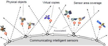 The previous solution was on the level of networked sensor nodes through which spatial control in SGL was explicitly propagating and following the object’s movement in physical space. In effective tracing of space objects under SGT we may also need a higher level of abstraction, associating with each physical object its unique virtual copy with appropriate name, which is imaginably moving in physical space similarly to the physical object. This organization is shown in Figure 6 for possible space objects orbiting the Earth, where virtual objects regularly update their space coordinates by frequently “seeing” their physical origins.