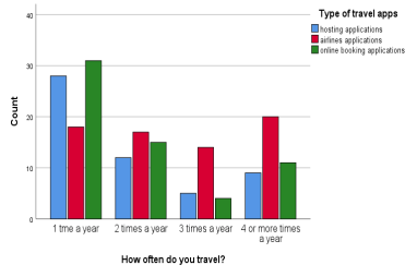 The analysis of the results allowed to observe that two of the age groups considered in the questionnaire included few participants ("less than 18 years old" and "66 or more"). Thus, a new variable was defined, which we called "Age". This variable had three categories, “less or equal to 25”, “26 – 50” and “more than 50” and was used to obtain the graph in Figure 4. In order to evaluate the association between the two variables under study in Figure 4, the chi-square test was performed and a p-value of 0.061 (>0.05) was obtained, so the null hypothesis should be accept and conclude that age does not have a significant effect on the use of travel applications.