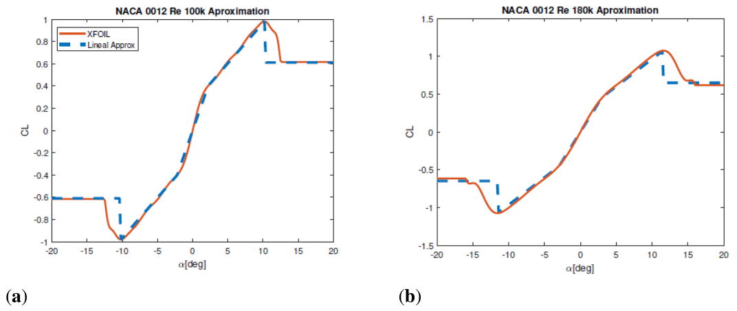 , proposed by Prandtl and Lieshmann. More details about the functions can be found in.16 Besides that, the inflow can be expressed with the full BET, without linearization, as it is done in.6 However, during the validation, it was observed that for low Reynolds were drag can be high and NACA 0012 can generate even negative lift with positive angles, Figure 1, imaginary terms would appear making impossible to converge the solutions. To solvent that issue and still consider the non-linearity and the dependence with the Reynolds number, lift curves were approached with linear segments, Figure 6.