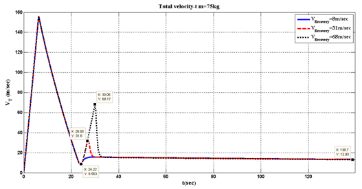 Second mode, sensitivity analysis of the recovery system is carried out at velocities beyond and below . This mode is aimed at considering the deployment point at two states of lower latitude and higher velocity as well as higher altitude and lower velocity (near acme), which are compared to the specified nominal point. These two states have been simulated for systems of m=75,100, 250kg at three recovery initiation velocities. The results show that increased recovery velocity has not considerable effect on the payload landing velocity. The main reason is that the parachute decelerates the system to the limit velocity, especially at high speed area. In addition, because the parachute has more drag at higher velocities, only negative acceleration applied to the payload during deployment increases. This is evident from the velocity diagram for the systems of m=75,100, 250kg. In Figure 5 weight of payload is 75 kg and parachute simulation done for 3 velocities. It is clear, landing velocities are same but in the higher velocities payload has more negative acceleration. If weight of payload increase to 100 kg and 250 kg, payload has same action but landing velocities are changed to 15 and 23.61 m/sec (Figure 6 & 7). These diagrams are shown in (Figures 5-7) which show that the range between m=100kg and m=250kg has unsafe velocities. As Figure 8 shows, because absolute value of the acceleration at deployment time for systems of m=75, 100, 250kg is less than the acceleration of the lower-mass systems, acceleration curve moves faster to zero, as a result of which velocity of higher-mass systems remains at unsafe area, and there will be no more chance for more velocity increase.