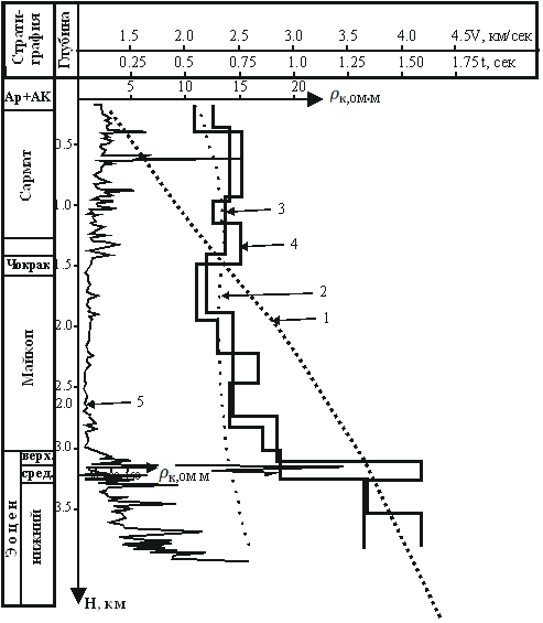 Figure 1 Curves of electric and seismic logging, well No. 4 of the Sazhdag area of the Kura and Gabyrra Mesopotamia.