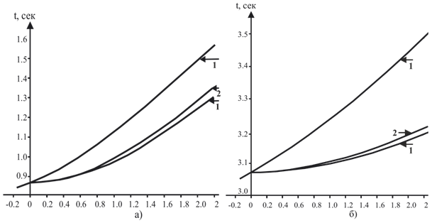 Figure 2 Travel time curves of the CSP and CDP of reflected waves calculated from the seismic logging data of well No. 4: travel time curves at: a - h = 1.0 km and b - 4.0 km; 1 - hodographs of OTV and CDP (at ); 2 - hodographs of the OTV and CDP (at );