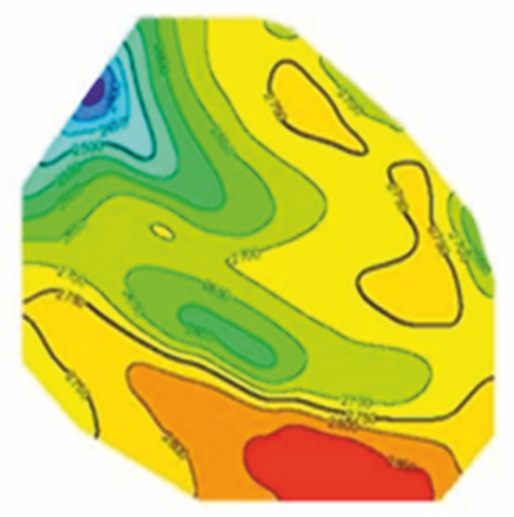 Then, on the basis of the compiled velocity model, velocity maps were built, one of which is shown in Figure 5, for the target horizons, and based on these data, 2D time sections were transformed into depth sections and seismic migration was applied and more accurate data on the depths of the target horizons were obtained.