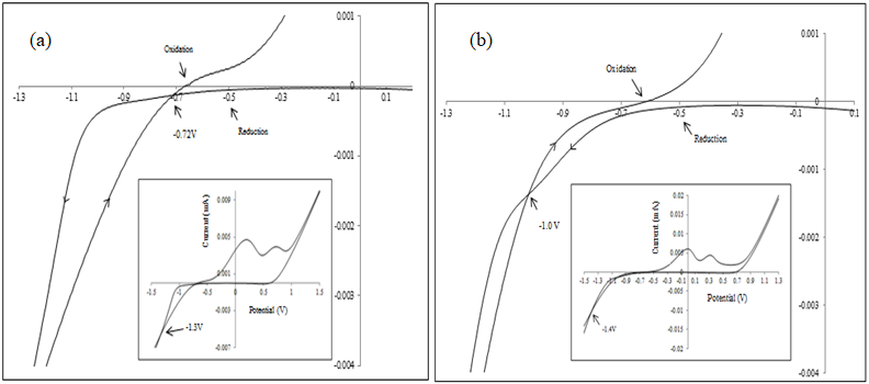 Figure 1 Cyclic voltammogram of the electrodes using ITO-coated glass substrates in alkaline solution bath of TEA and (a) NiSO4 + Na2S2O3 (b) NiSO4 + Na2Se2O3