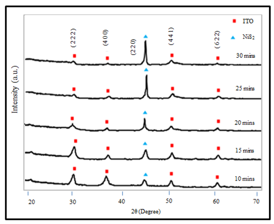 Peaks belonging to NiS2 film deposited for a period of 10-30 minutes is detected and labelled as shown in Figure 3. The structural features fit into the cubic structure of the NiS2 film with lattice parameter values a=b=c= 5.668nm which is in good agreement with the standard values.29 Only a single peak is attributable to NiS2 with lattice plane (2 2 0) at 2θ = 45.5º. Intensity of the peak (2 2 0) increases dramatically at 30 minutes indicating that the film grow with respect to time. From Figure 3 it is clear that the intensity of ITO peaks are initially higher for 10 minutes film which is further suppressed as the deposition time increases. This is confirmed that higher film thickness reduces the effect of substrates it utilized.