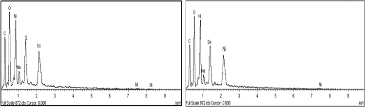 As shown in Figure 7, Energy Dispersive X-ray (EDX) was used to analyse the film stoichiometry of the prepared samples of 30 and 25 minutes for NiS2 and NiSe2 respectively. These samples are considered to be the optimum films for revealing their stoichiometry. The strong peaks in the spectra for Ni, S, and Se were identified and are near stoichiometric with ratio close to 1:2 as presented in Table 2. Although elements of C and O do not have any influential role in the synthesis of the films, their peaks also observed in the spectrum corresponding to the capability of EDX to detect as low atomic number elements such as carbon and oxygen, which is ubiquitous in our environment. Inclusion of oxygen is found in all the films because it is found to be unavoidable for chemically deposited films as testified. This is true and accepted for all films synthesized.6 Furthermore, the spectrums also display smaller peaks of Na, which has been expected as Na was used as a precursor in the electrolyte for the deposition of films.